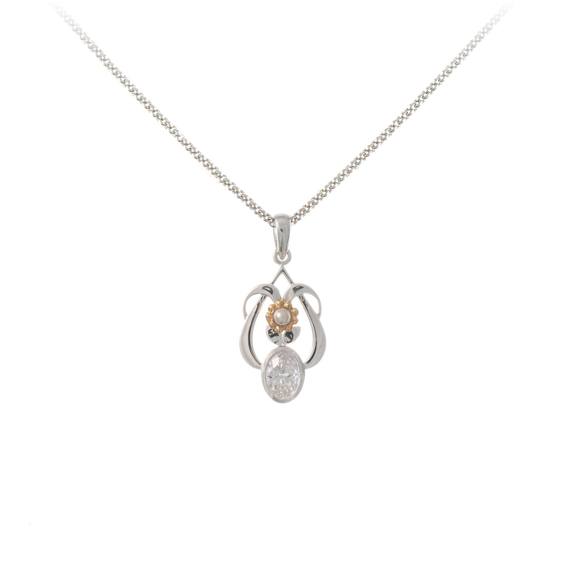 Anhaenger mit Kette 925 Silber teilvergoldet Zirkonia weiss Perle